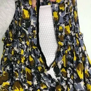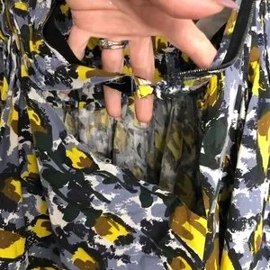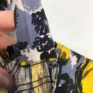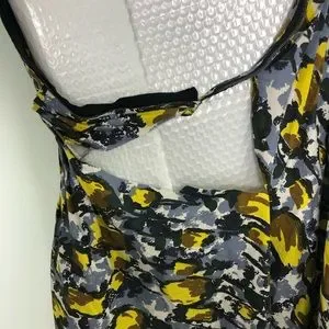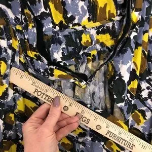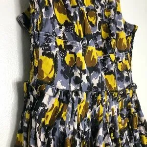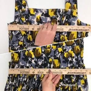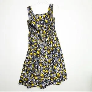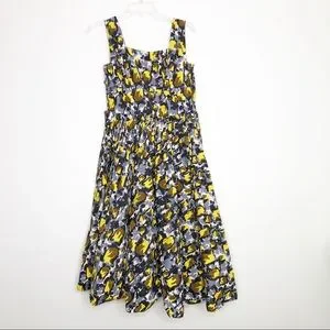 Slate and yellow printed cotton (100% Cotton). Full skirt. Sleeveless. Square neckline. Exposed back zipper closure. Partially lined. 44" from shoulder to hemline. Imported.