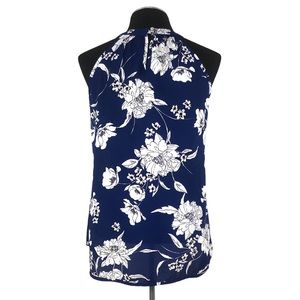 Solid woven fabric with a blue background and a white floral print throughout. Sleeveless halter style top with a pleated round neckline, keyhole opening in front, and double silver metal button closure in back. Top is in excellent, like new condition with no flaws. Originally sold on Stitch Fix. Feel free to ask questions. Save more with bundled items!