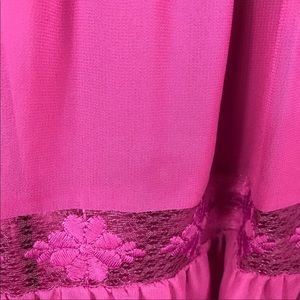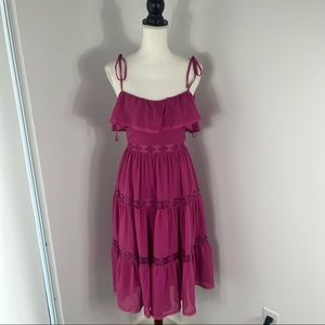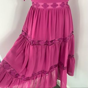 Delicate embroidered insets stripe the waist and skirt on this breezy chiffon sundress with a charming popover-ruffle yoke and top-tie shoulder straps.