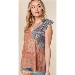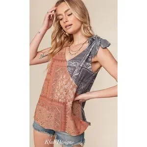 BOHEMIAN ETHNIC PRINT RAYON CHALLIS COLOR BLOCK V NECK WITH RUFFLE SLEEVELESS WOVEN TOP