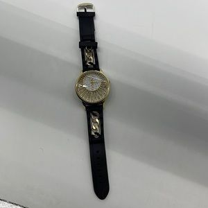 Absolutely stunning Black, Gold & Rhinestone Statement Watch. Band is silicone with gold chain in between. Face has a starburst of rhinestones with clock. New in an open box and with a working battery.