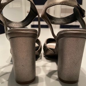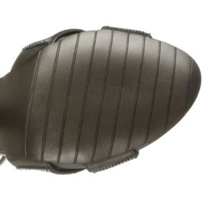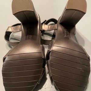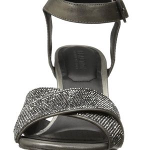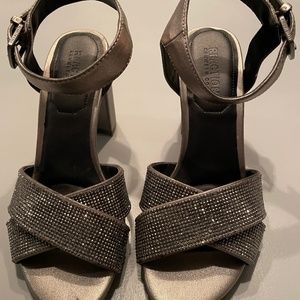NWOB Kenneth Cole REACTION Crash glitzy dark pewter (hematite) dress sandal w/ X-band toe straps covered in silver mini jewels.100% vegan leather insole with adjustable buckle ankle strap and non-marking flexible rubber outsole on 1/2 inch platform and 3 1/2 inch heel. Never worn with no defects. Comes from a pet and smoke free home.