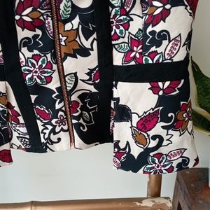 This is an amazing jacket/ top. Unique peplum style design with European fabric, designed and made in Australia. MRP is 189 AUD. Rose gold zipper on front. Sleeveless. High quality material with botanical print and black design for a feminine structured look. Wear it by itself or over a flounce sleeve shirt. As new. Perfect condition. For more measurements, feel free to ask in the comment section below.