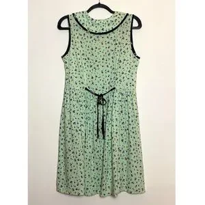 Super cute vintage 1980s light green sleeveless dress with collar and pockets, size L. Very good preowned condition. One tiny flaw in the fabric near the collar—barely to not noticeable. And a couple of very tiny spots on the front—again, you really don’t notice. I’m just disclosing my observations of any flaws. See photos. The dress really is adorable and perfect for summer. There are three whimsical multicolored buttons in front, pleated and flared skirt, black piping along the collar, arm holes, and pockets. Ties in back. Lovely pattern of tiny flowers. 100% rayon, no stretch. A great find!