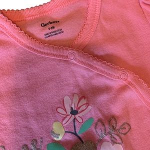 3- Gerber 0-3 month outfit. Snap front top, with flowers and says “love”. Pants are footed and have matching floral design, gold accents are all glittery. VGUC, no stains or flaws noted. Comes with matching hat, shown in pictures.