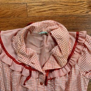 This cute, long sleeve dress is made from and orange and white gingham fabric with bittersweet colored ribbon accents. Smaller print gingham at yoke and hemline. Elastic at waist allows fit for various sizes…elastic is in good condition, still stretchy, no signs of dry rot. Button front with ribbon tie detail at collar. No size marked, fits like medium or large…see measurement photos to determine fit. There is some discoloration in collar (see photo). Elastic in cuffs is no longer stretchy…due to gathered stitching they have kept their shape.