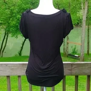 Black Capped Sleeve Tee with Black Beaded Floral Detail