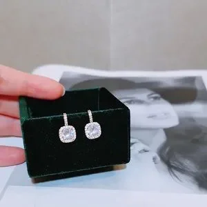 In super cute Silver finish fixed earrings featuring cushioned halo to a round cut diamond look, minimal dropped design