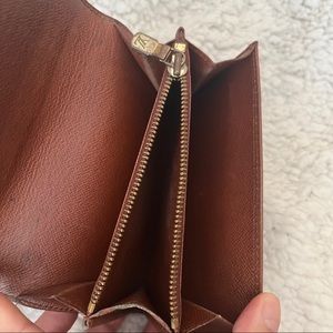 Good used condition No damage in the canvas and leather Signs of use especially in the interior Has a few fades and could use some cleaning in the coin compartment Perfect size wallet to hold cards, bills and coins Gold hardware has a tiny tarnish This is a preloved item, please manage your expectations