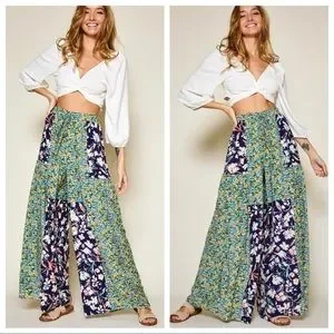 Non stretch fabric with a mix of florals, wide leg, flowy fit, elastic waistband with drawstrings.