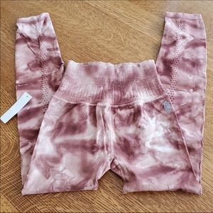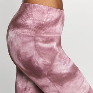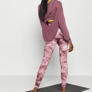 NWOT. Free People Movement Good Karma tie-dye leggings in frappe (a brownish mauve). High-rise, 7/8s length, perforated down the back.