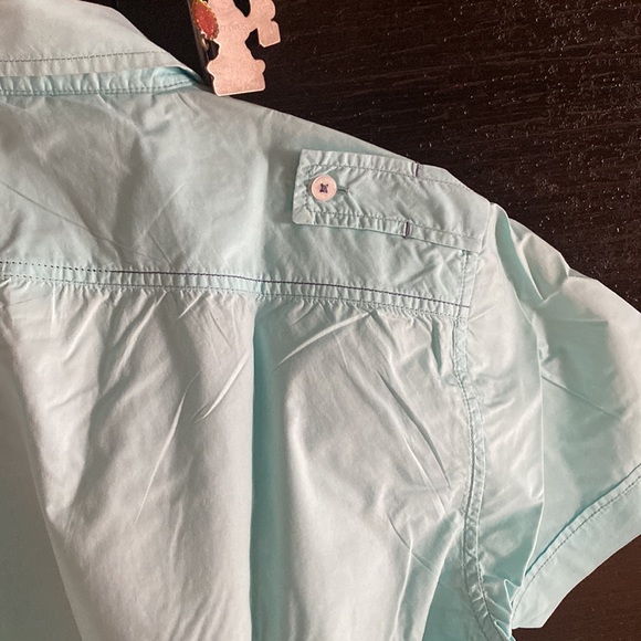 Basics light blue Mens casual shirt.Shoulder has flap/buttons design.Front 2 pockets.Half sleeve.