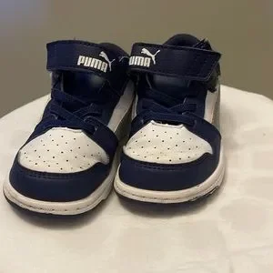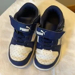 Puma! Toddlers shoes blue and white size 8! Have been loved but still in good condition! Pictures are pretty accurate if you need anything else I’m more than happy to help!