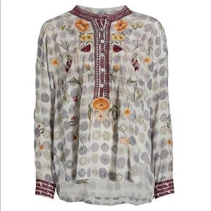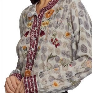 Cut from luxe silk, this blouse features a flowing silhouette with detailed embroidery over a printed pattern. Johnny Was of Los Angeles does not disappoint ! Quick ship from smoke free home.