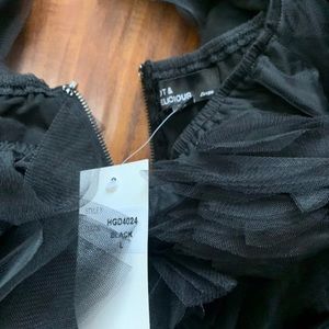 Off shoulder dress with tulle floral detailing. Fits true to size, zipper in back. Can be cute for any dress up occasion. Not branded but can’t change