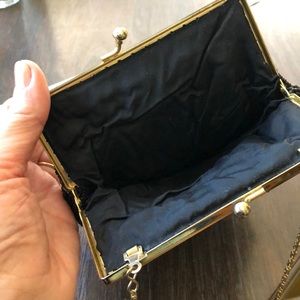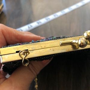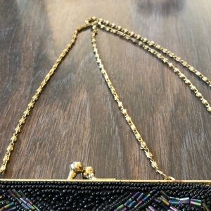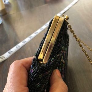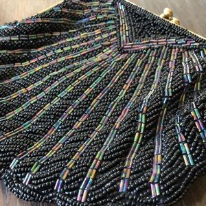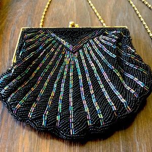 This is a vintage seed bead black with purple pink green blue yellow accent beads cascading down into a scalloped clam shaped with gold trim bag gold chain in good condition beautiful for night or a prom please refer to photos thank you💕