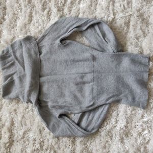 Very good used condition, no rips or holes. One tiny orange stain (see pictures), hardly noticeable and may come out in the wash, I haven't tried. Slight pilling. Light grey long sleeve wool blend sweater, ribbed waist, balloon sleeves, and a large cowl neck.