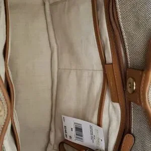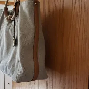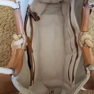 Natural canvas accented with rope handles and leather trim.