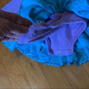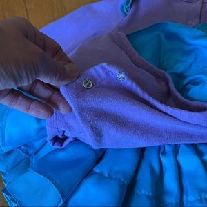 This is a cute onesie! It has a cute sequined shell on the front, with “Ariel” beneath it. Snap closures for easy changing! It shows a little wear, some piling , but is still adorable! However, I will price it down accordingly. Apologies for the odd lighting that kept changing the shade of the colors. Close up shots are the closer color match. See pictures for details and condition. Questions? Please ask before purchasing. Bundle with other items and I’ll send you a discounted offer.
