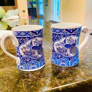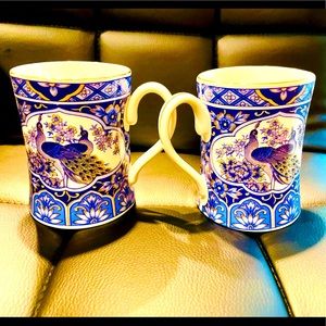 Gorgeous Set of 2 Imperial Peacock porcelain blue peacock mugs