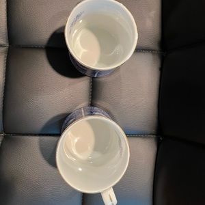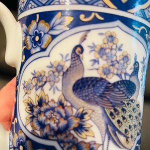 Blue peacock design on white base color with gold trim. Gold trim on 1 mug in one spot has chipped off very slightly as pictured in last 2 photos otherwise in Excellent Condition..