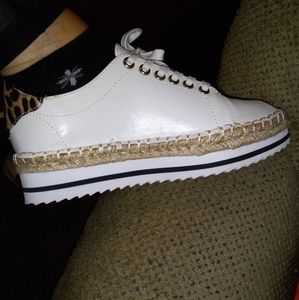 white jlo platform sneakers white rubber bottom with black stripe then espidrill material then white man made upper with leopard design on back of shoe gold hardware were you tie up laces...in almost brandnew condition..beautiful on trend for spring and summer...