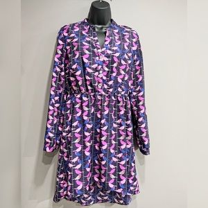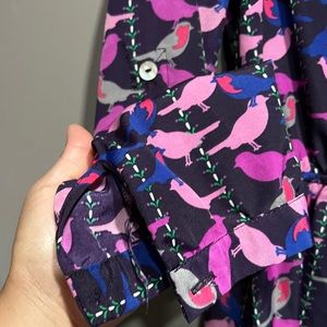 Per- loved in excellent condition in size (M) it has some beautiful bird purple pink roll-tab sleeve high-low (100)% Polyesters