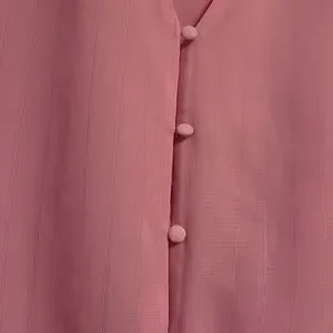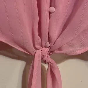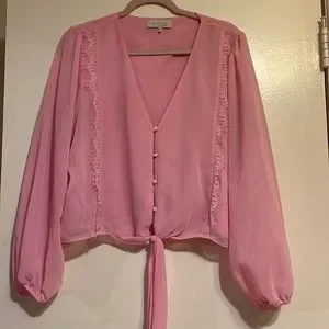 Pink lacy tie front button down blouse with puff sleeve