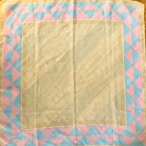 Such an unusual combination of colors. Would accent so many fall sweaters beautifully. In good condition. One small mark that isn’t noticed when worn. Semi sheer with a beautiful drape. Measures approx 26” square.