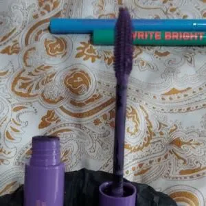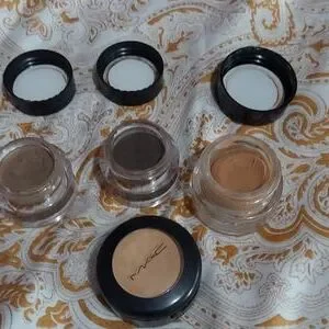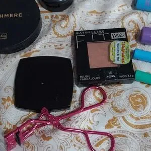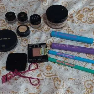 A lot of makeup. 2 blushes One is Cashmere brand. The other is Maybelline New York. 2 brow pomades brand Cashmere one is light brown. The other is brunette. in brand Cashmere. . 1 MAC eye highlighter. 1 dermablend setting powder in cool beige. Used but still quite a bit left. 1 Avon true color eyeshadow primer. 1 avon eyeshadow subtle in color Champagne. 2 gorgeous colors in Mascaras. 1 is power purple the other is blue pop. 2 eye liners 1 is blazing blue and the other is lit green. And an eye lash curler brand is beauty 360. All have been sanitized. All are for the most part full products except for the dermablend. Lots of nice fun makeup.