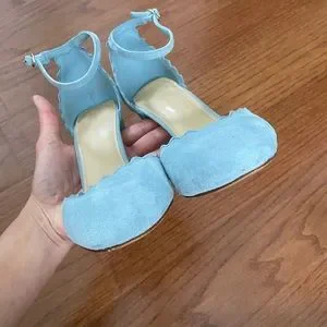 Baby Blue suede ankle strap pump with 4” block heel. Excellent pre-loved condition. See photo for small flaw on side of left shoe.