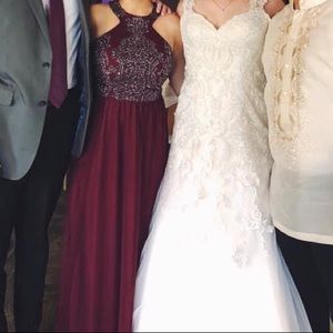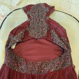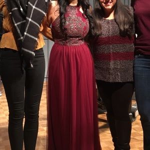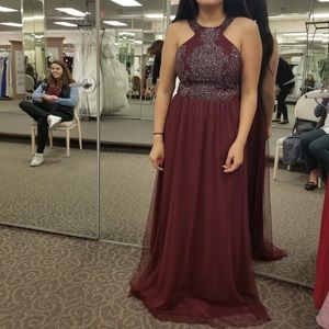 Floor length burgundy Bridesmaid Dress with silver beading details on the halter top, and a mesh skirt. The back has an opening.