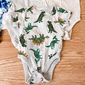 Good condition. White, light gray, oatmeal, Blue tie dye and dinosuar print.
