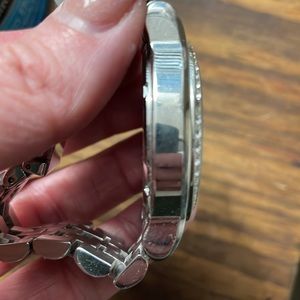 MK Silver Watch. Faux diamonds around face. Needs battery. Face has no scratches. Some small scratches on band links and clasp. Not very noticeable when on.