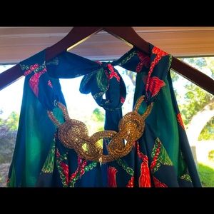 Halter dress with beautiful tassel silk fabric; intricate beading at the neckline; zipper in the back. Excellent condition! Comfortable and stylish. Classic and bold.