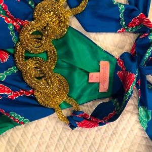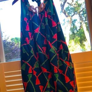 Lilly Pulitzer 100% silk blue and pink tassel dress with gold neckline + pockets
