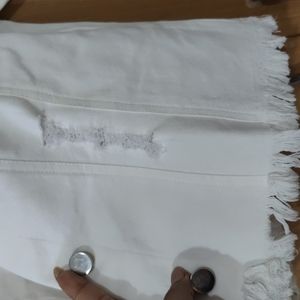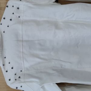 it's a white colored denim jacket...there r metal detailing on shoulder and back...a bit ripped off from waist area and fringes at the bottom...