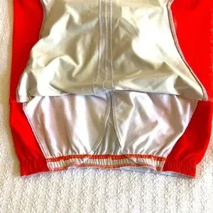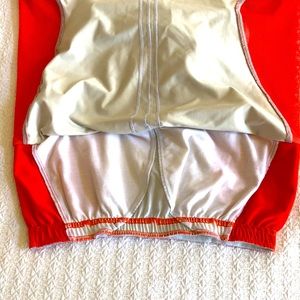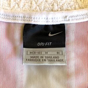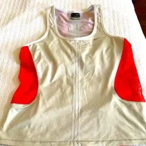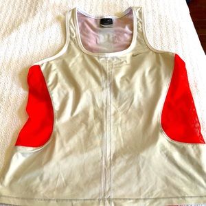 Nike top with shelf bra in good condition. The colors are orange and cream. A few stitches are off at a corner, which can be repaired. See the last pic. Please bundle with 3 other 4/$25 items for a great deal.