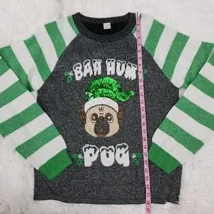 This is a cute Pug holiday sweater. Would fit best for a size large. Please see measurements above. Material is stretchy. No flaws and in excellent condition. Or could be cute oversized sweater for a smaller person.