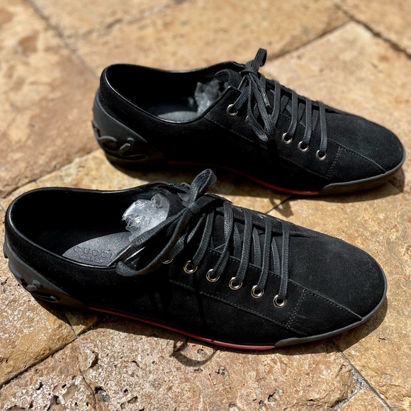Gucci black suede sneakers with rubber soles. Back of soles read signature Gucci script logo and side have red stripe. Back of shoes have Gucci written on the heal.