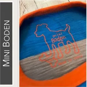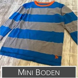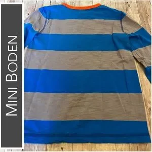 Mini Boden Blue & Gray Wide-Striped Long Sleeve Shirt with Orange Neck Band EUC