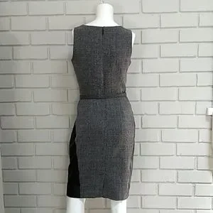 Very classy business dress that is black/gray with faux leather detail.