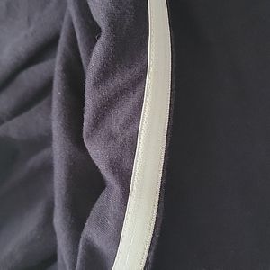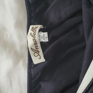 strapless mini dress. has slip under and elastic with silicone grip so it won't slip. worn only twice. pretty navy blue with pattern flowy skirt. great to dress up or down .