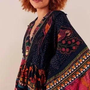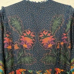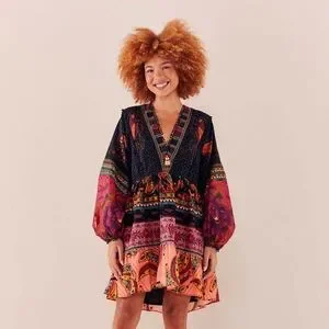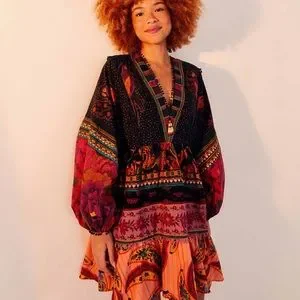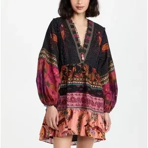 FARM RIO Patchwork Mini Dress with floral, tropical bird, and banana prints. Puffed sleeves with a deep V neck and beaded lady detail.