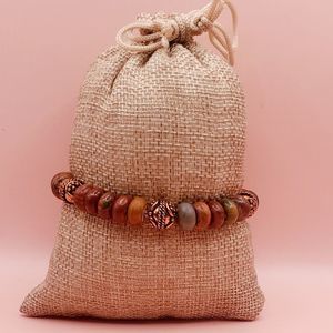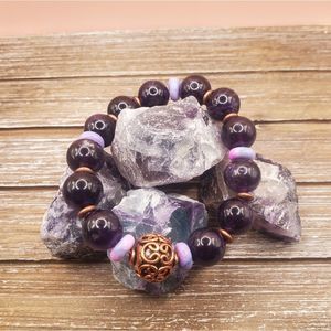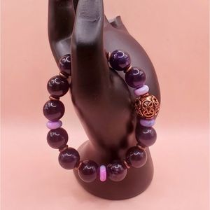 -12 mm amethyst rounds, 10 mm Morado opal rondelles, 6 mm copper spacers and a 14 mm Bali style copper focal bead, strung on elastic beading thread