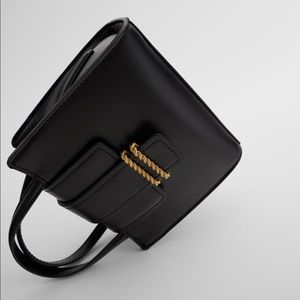 Black city bag. Double golden cord detail on the flap. Handles and an adjustable, detachable shoulder strap. Lined interior with pocket. Magnetic closure