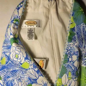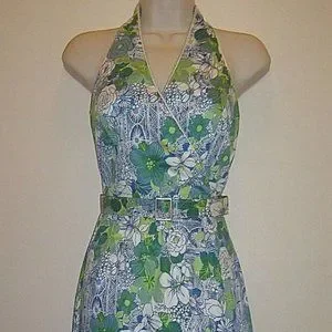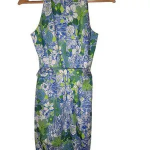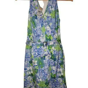 Description: Talbots Maggy London Sleeveless Dress NWT 2 Petite. Beautiful light blue and lime green floral design. Light blue scalloped trim on the neckline and bottom hem. Has a matching belt. 2.5" slits on both sides of the skirt. Fully lined. Hidden back zipper closure. In excellent condition; NEW WITH TAGS. Made in the USA