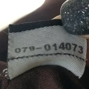 Brown with short sleeves . Design in beige, white, blue, red, yellow, black with small crystals in similar colors. I don't see any crystal missing, but please refer to the pics.