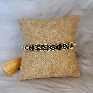 Gold back ground with Black letters "CHINGONA" Adjustable, slide pull.