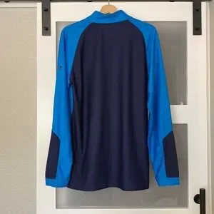 Under armour quarter zip in blue and navy. Size L. Medium weight. Logo on chest. Excellent used condition. See pics for measurements